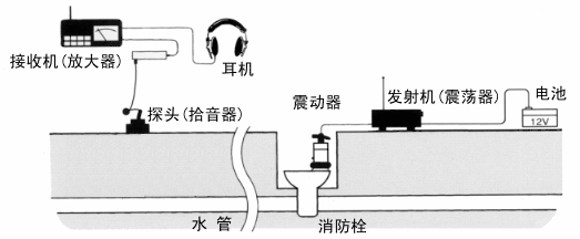 如下圖所示,放在消火栓上的NPL-100振蕩器發出的聲波信號沿埋于地下的壓力水管內部傳遞,該聲波信號亦能傳至地面。NPL-100的拾音器在地面上捕捉該聲波信號,接收機將信號放大并通過儀表和耳機指示