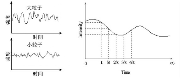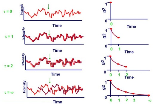 接收器在短時(shí)間內(nèi)多次測(cè)量某一位置光的強(qiáng)度,如果測(cè)量的是小顆粒那么光強(qiáng)度會(huì)很快變化,如果測(cè)量的是大顆粒那么光強(qiáng)變化會(huì)比較緩慢。在某個(gè)點(diǎn),如果時(shí)間t1和時(shí)間t2測(cè)量到的光強(qiáng)完全一樣,那么光強(qiáng)相關(guān)性為1(完全相關(guān)),如果測(cè)量到的光強(qiáng)完全不一樣,光強(qiáng)相關(guān)性為0(完全不相關(guān))。繪制出光強(qiáng)相關(guān)性隨時(shí)間變化的曲線,如下圖所示。